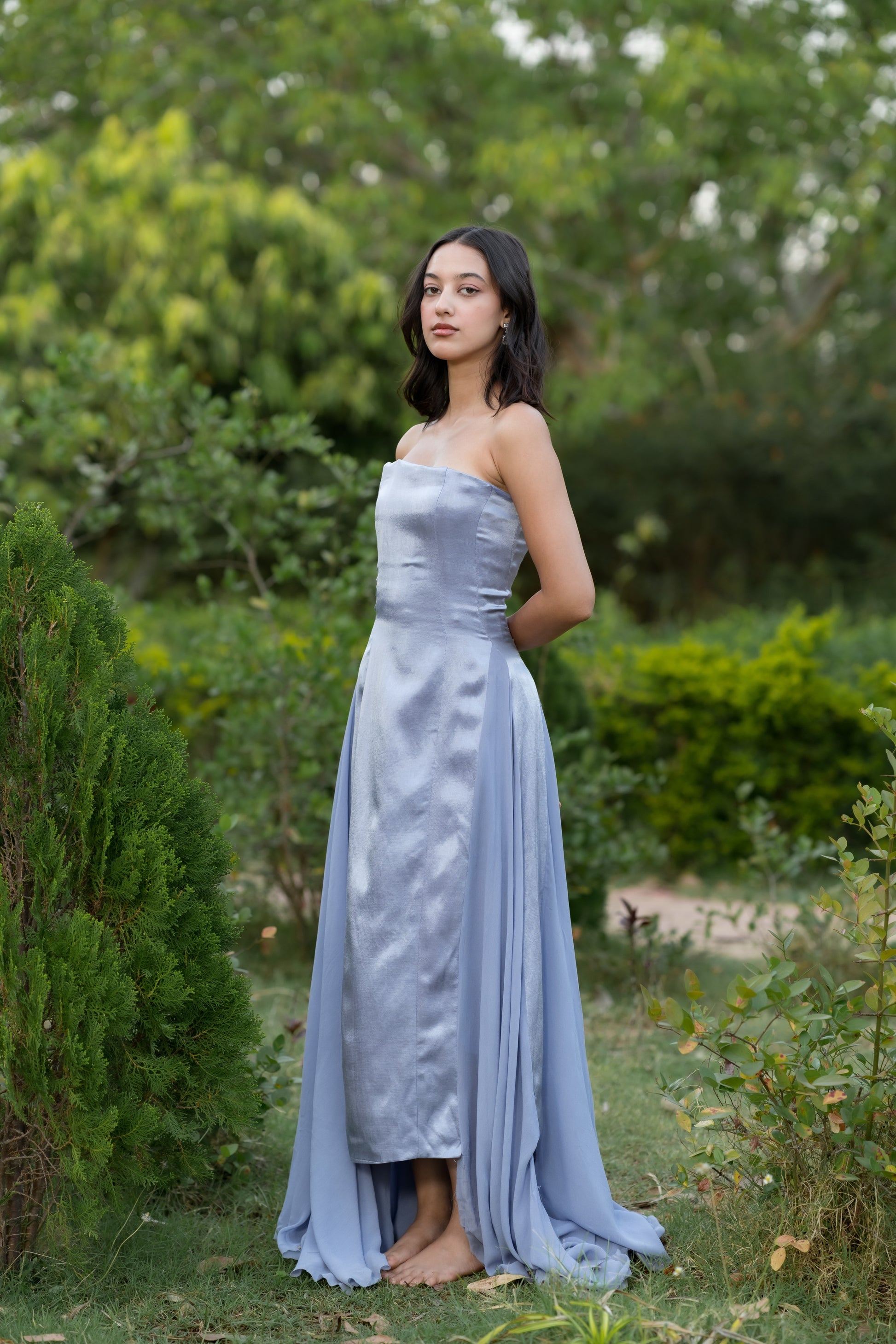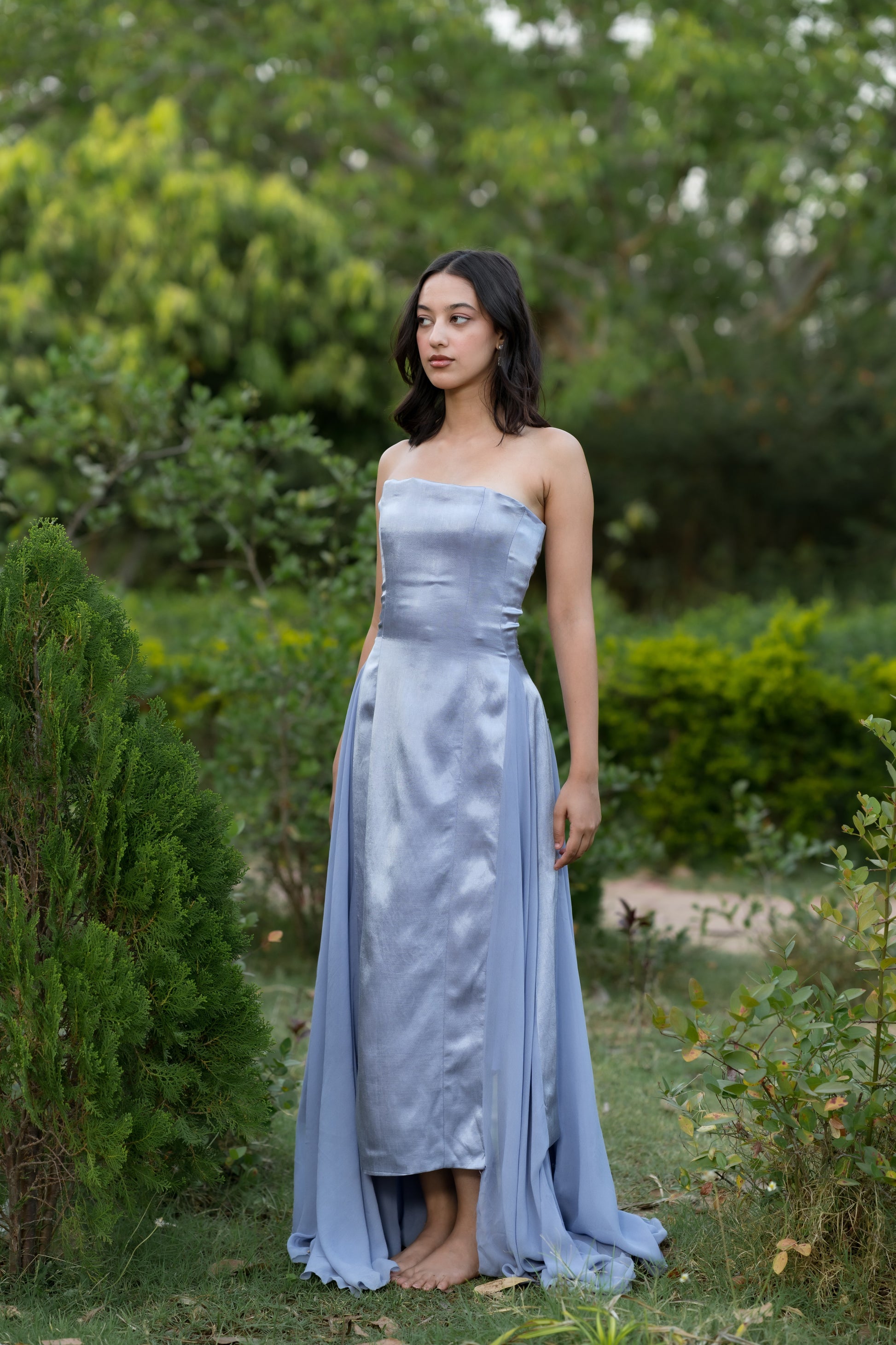 Ethereal and effortlessly graceful, crafted from a luxurious blend of Gaji Silk and Georgette, combining structure with fluidity. Rendered in a soft, icy lilac, the gown features a sculpted, strapless bodice that flatters the neckline, flowing into a dreamy high-low silhouette that moves with elegant ease.