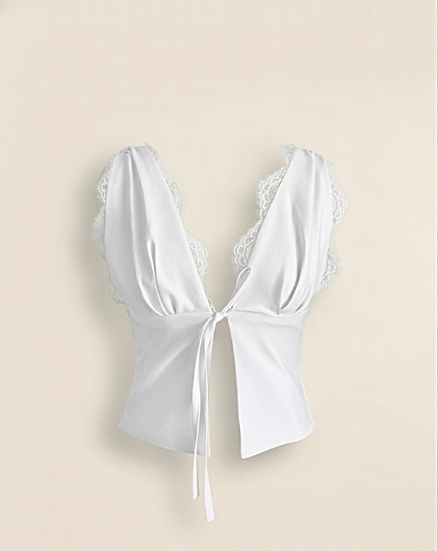 Effortlessly elegant, endlessly romantic. The Princess Era Top is crafted in soft white with delicate lace tracing the shoulders and a tie-front that flatters your silhouette. It’s light, feminine, and carries that quiet luxury feel.